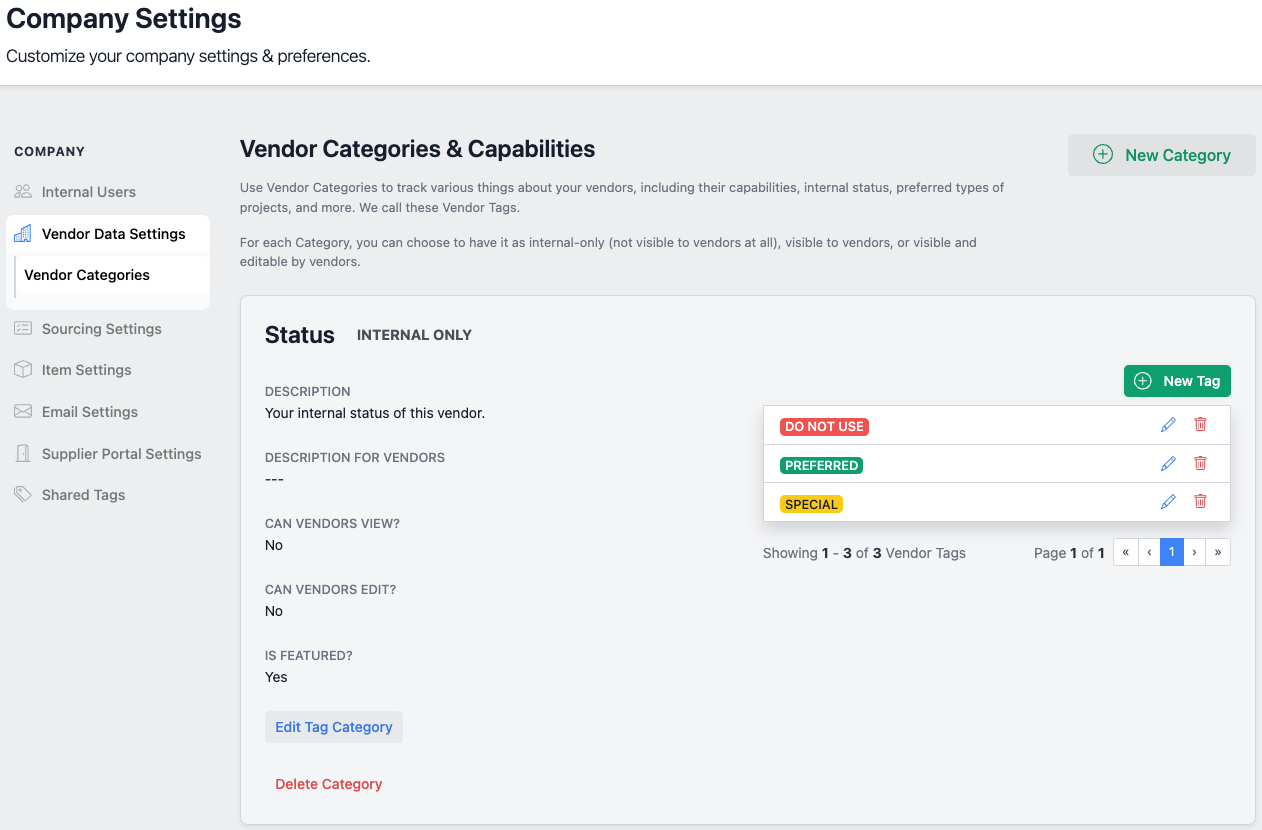 To add tags to a vendor, open the Vendors page, pick a supplier, scroll down to Categories & Capabilities, then hit Edit. From here you can easily manage all tags for this supplier.