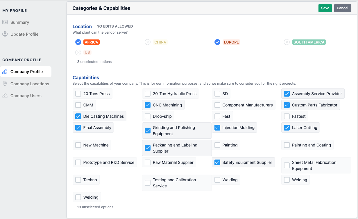 - Can vendors edit: You have the option to allow vendors to edit their own tags in the category. This could be useful if you want the vendors to manage their own capabilities. Below you can see an example of how it would look like on the supplier side: