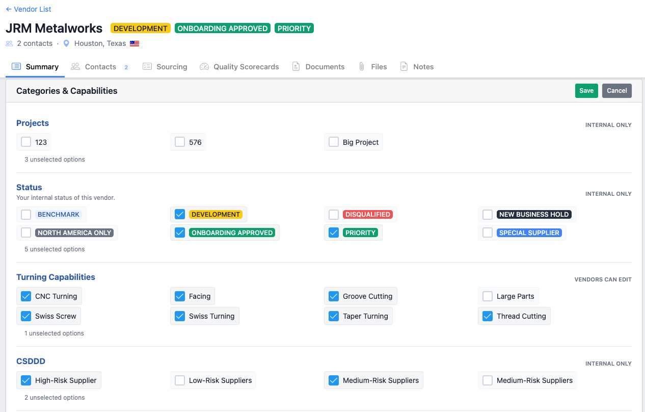 Supplier tags are useful for the basic function of keeping track of various supplier information — status, capabilities, risk level, locations, and more — and managed in a centralized, easy-to-use system that is accessible to everyone in your company who needs such information.