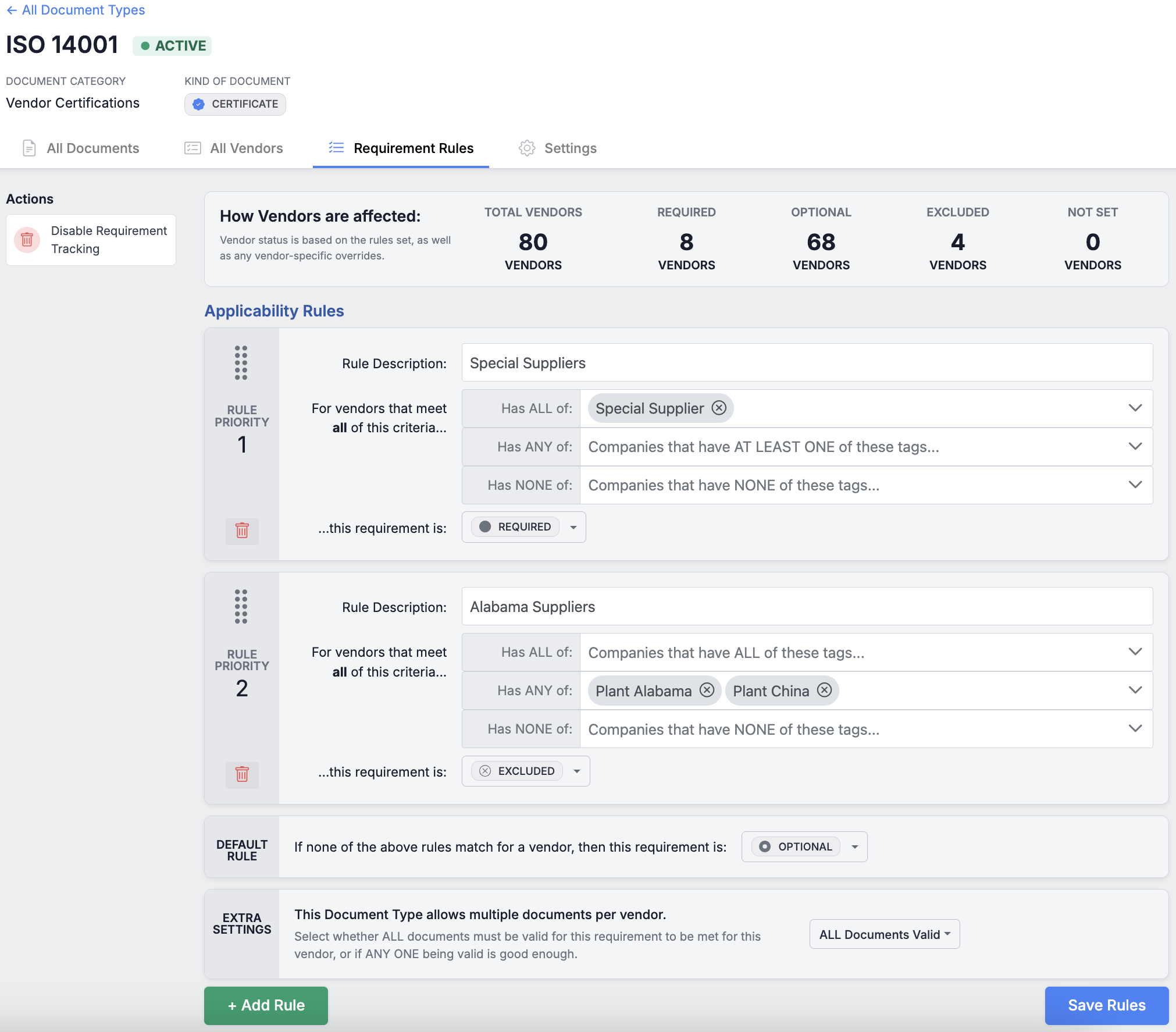 You can then add rules to define which suppliers have the document type Required, Optional, or Excluded.