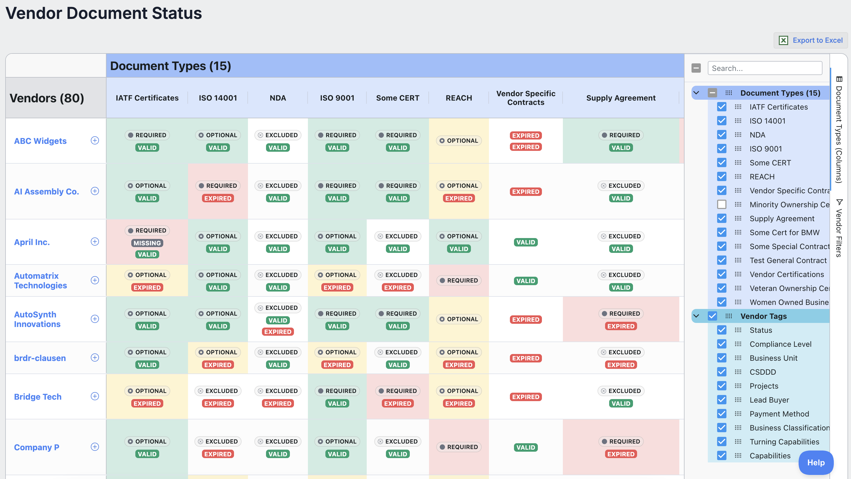 The grid is color-coded to help you quickly identify which supplier documents need attention.