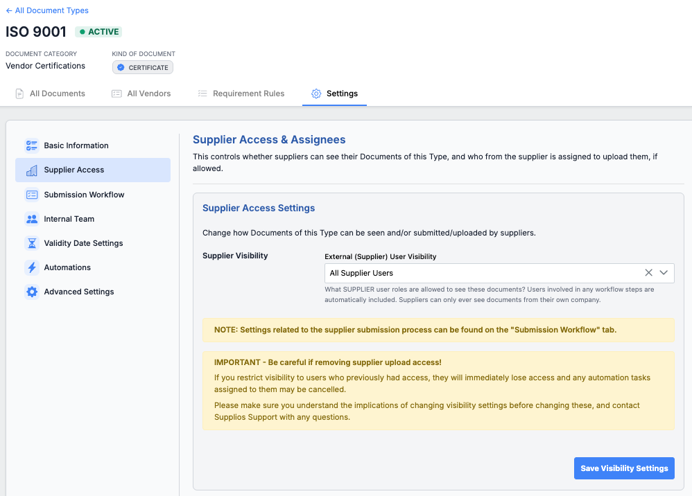 This article covers the settings related to supplier visibility and supplier submissions for Documents in the Supplios Compliance module.