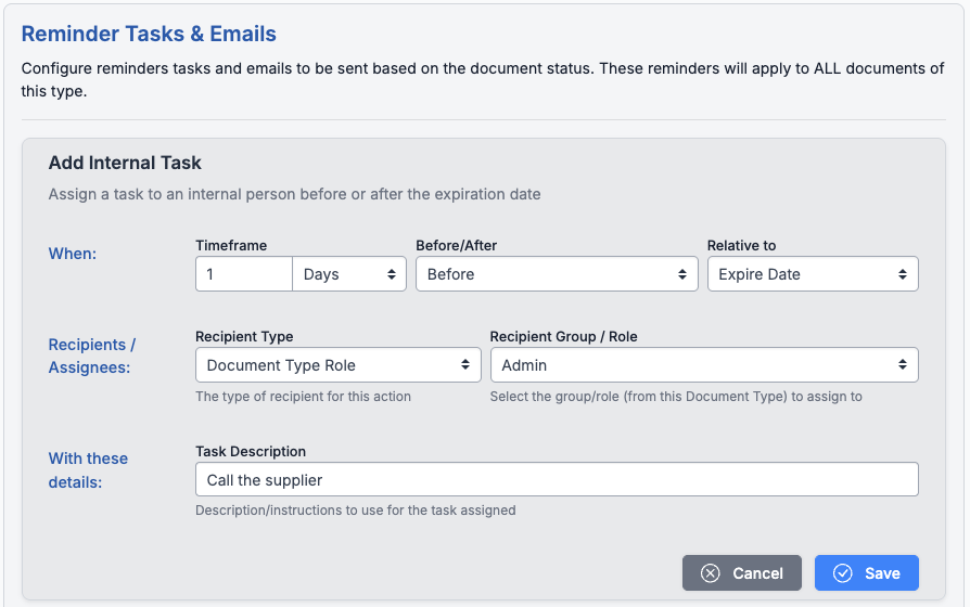 You can add extra reminder tasks and emails to internal or supplier users. For example, you could create a task for the Document Type Admin to call the supplier if the document hasn’t been uploaded 2 days before expiration.