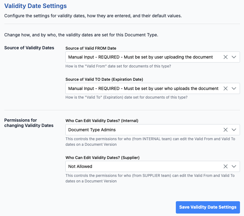By default, only Internal Document Admins can edit validity dates, however, you can enable other internal users and supplier users to edit them, if needed.