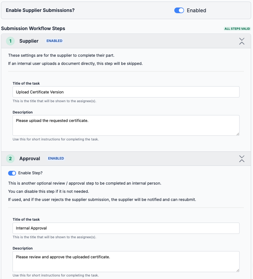 - When Supplier Submissions are enabled, the default workflow includes two steps: