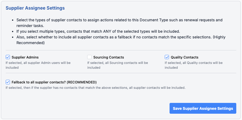Choose which supplier users receive renewal requests and reminder tasks for expiring documents: Supplier Admins, Sourcing Contacts, and/or Quality Contacts.