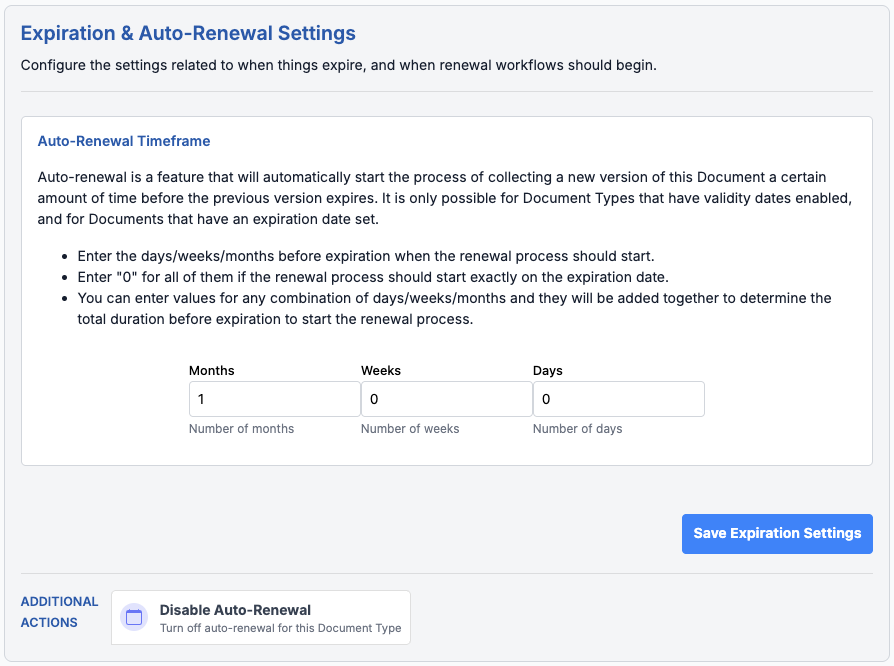 Auto-renewal starts document collection (the submission workflow) automatically a set time - months, weeks, or days before expiration. Assigned supplier users will receive notifications and tasks to upload a new version.